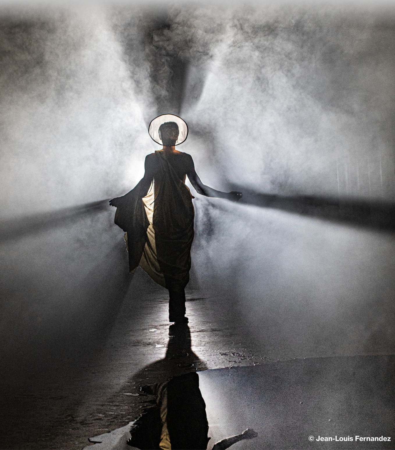 Carlo revient donc ; nous sommes trois heures et demie après le début, et tout va s’achever — et il se manifeste enfin, corps restitué après ces heures d’absence, d’effacement, de duplication, silhouette qui sort de l’ombre pour entrer dans une lumière si forte qu’elle efface ce qu’elle révèle. Il a revêtu ce costume d’ange, de saint : l’attirail dérisoire et bouleversant d’une sainteté de théâtre. Il avance à contre-jour, irradié, intouchable : le corps nous est rendu au moment même où il nous échappe. Dans ce théâtre sur le pouvoir, voilà qu’il affirme son propre pouvoir : offrir une présence en la retirant, produire la figure au lieu exact où elle se dissout.