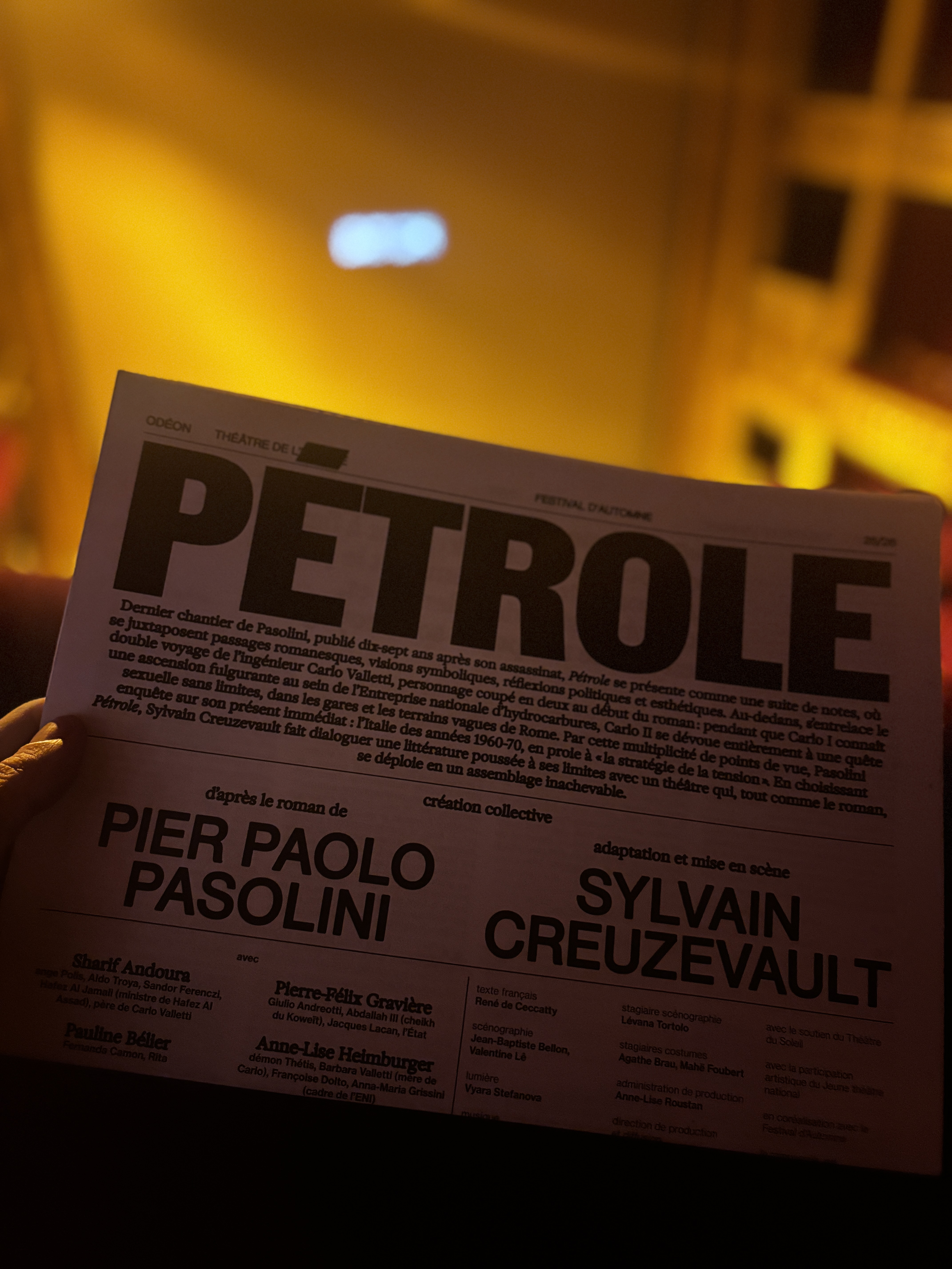Et si {Pétrole} n’est pas une pièce de théâtre, ce n’est pas non plus tout à fait un roman, plutôt une lutte contre toute forme donnée d’avance — vision, note sèche, article, poème, citation, plagiat, scénario — écriture qui déborde la dramaturgie pour rejoindre quelque chose de plus brut, tout en étant passée au filtre d’une conscience qui l’élabore toujours en la réajustant. Ce qui rapproche {Pétrole} du théâtre tient pourtant à cette sensation (propose Creuzevault) de travailler avec une fièvre directement reliée au corps de l’auteur » : des pages-corps, un corps-trame Pasolini, non pas autobiographique au sens psychologique, mais politique, au sens presque cynique du terme — en chair et en os.