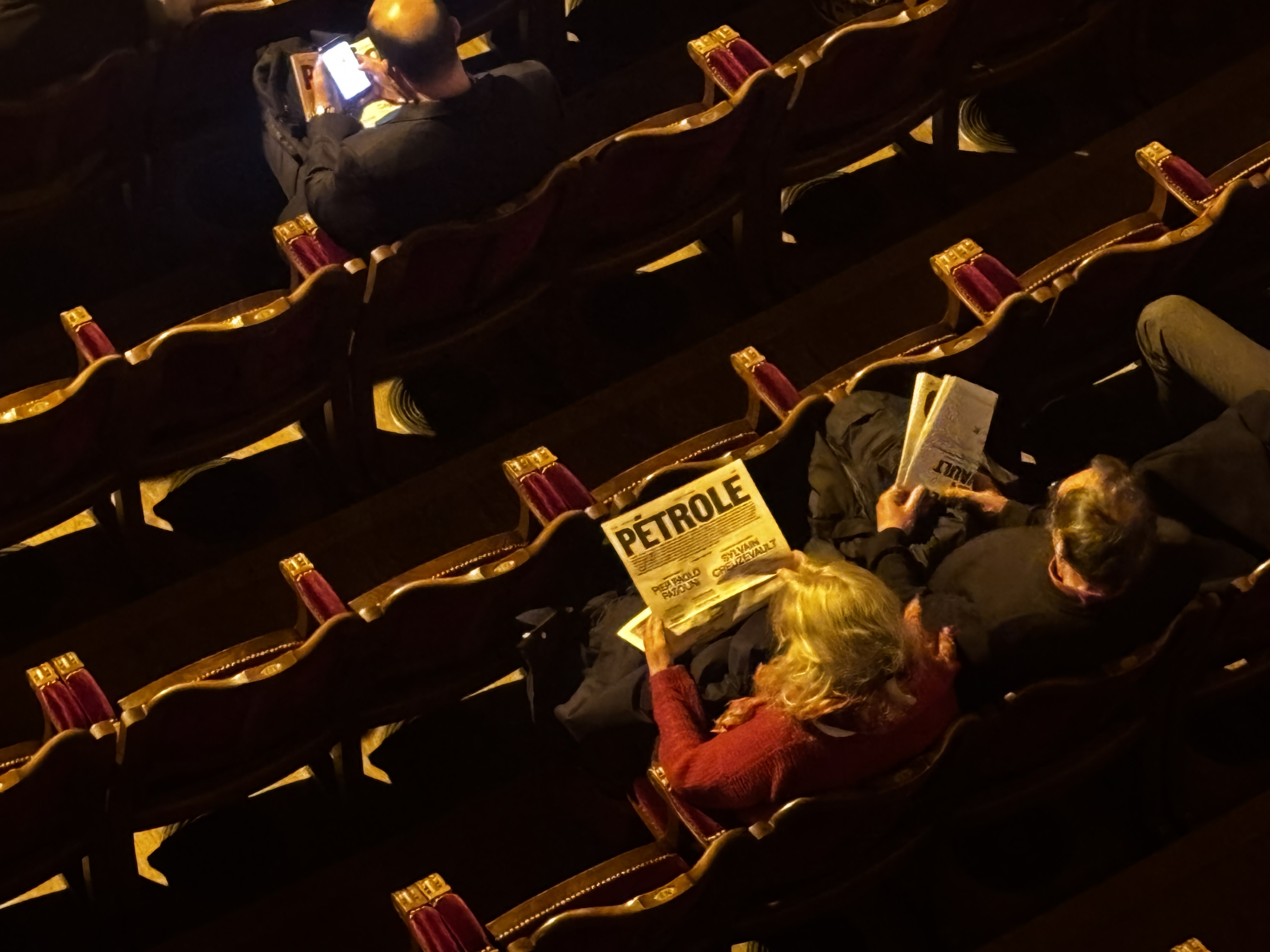 À cet endroit, l’acteur n’est plus seulement interprète : il devient acteur-dramaturge, pris dans l’intelligence active de tout le dispositif. Il travaille la parole, mais les images aussi (et surtout ?), les cadres, les rythmes et les machines et les accidents ; tout ce qui circule sur le plateau, y compris ce qui déborde l’interprétation. Jouer consisterait alors à capter et infléchir des forces : conspirer {avec} elles. L’acteur respire avec le texte démonté, avec les autres corps, avec la vidéo, avec l’histoire elle-même telle qu’elle travaille la matière sans jamais se fixer en récit. {Pétrole} déjà conspirait : par démontage, ou par faisceaux d’indices, montages instables, et révélations partielles qui refusent toute vérité pacifiée.