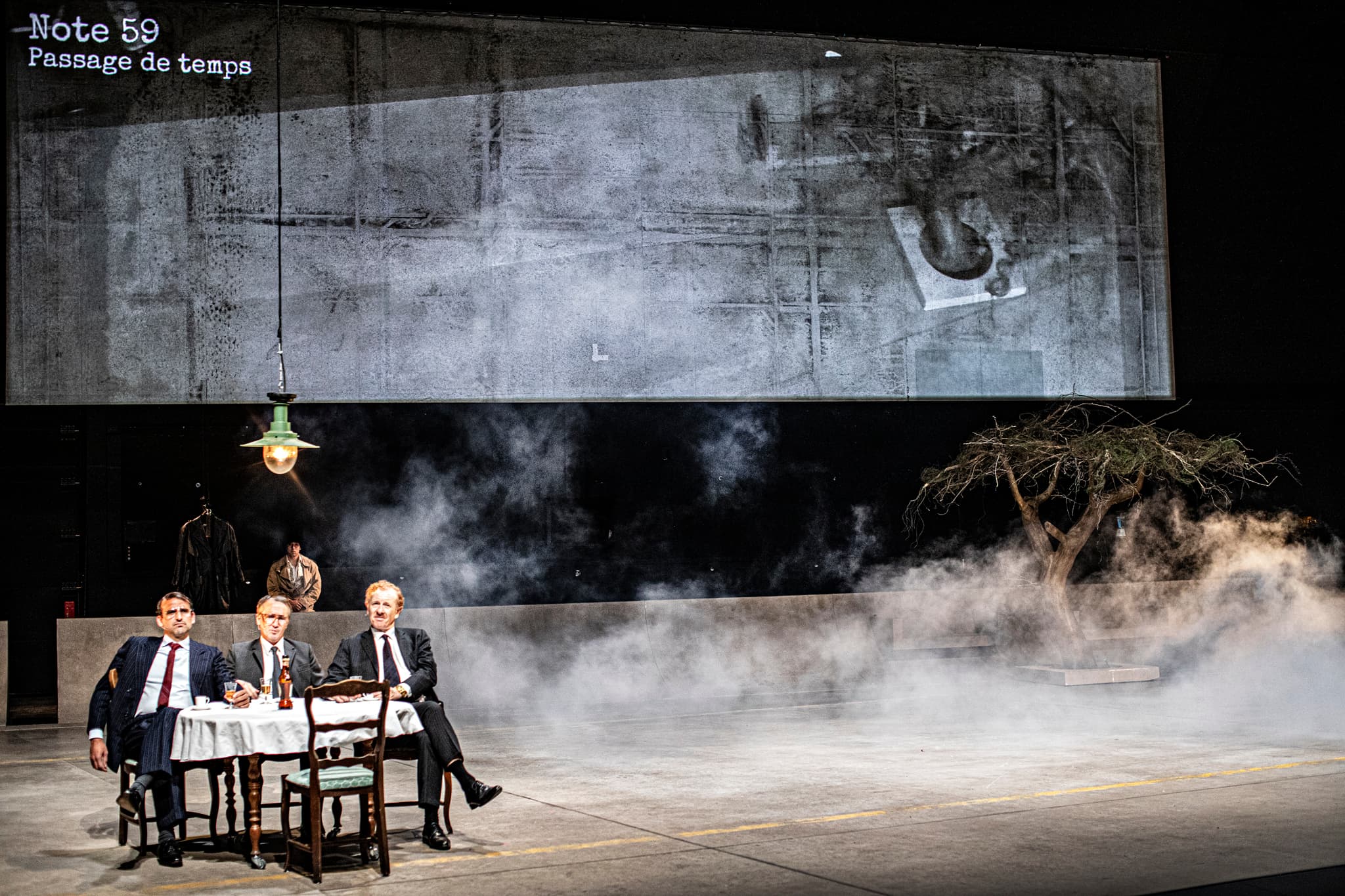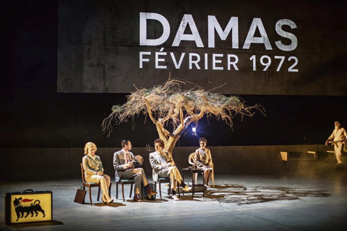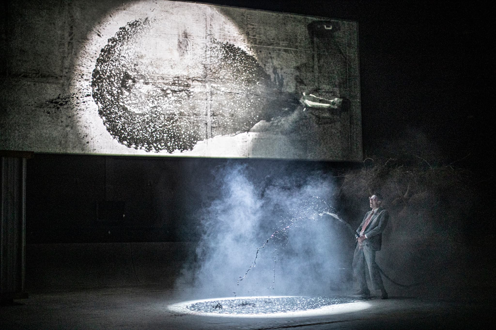 A-t-on besoin de le dire et d’un spectacle pour le voir ? On a besoin d’un spectacle pour traverser ce paysage et en éprouver à l’échelle le terrain où le temps a lieu, et mieux prendre position : ce paysage, bien sûr, c’est le nôtre. Pasolini avait prévenu : « pas de perspective historique ». Nous sommes dedans. Dedans, encore. Il ne s’agit alors pas de comprendre, mais de suivre. Suivre le mouvement, la crête, les fractures, les zones de silence. Suivre ce qu’il y a entre les fragments plutôt que les fragments eux-mêmes. Et c’est peut-être la grande délivrance de ce spectacle : on ne nous demande jamais de nous attacher aux personnages — Carlo I, Carlo II, les mineurs, les pontes de l’ENI, les psychanalystes sur leur chaise longue : ils passent ; ils agissent, se dissipent, reviennent, se dissolvent. Aucune empathie possible : comment être affecté par ce qui leur arrive ? En lieu et place, être plutôt affecté, oui, par ce qui arrive — flux continu de catastrophes qui ne cesse de déborder sa propre scène.