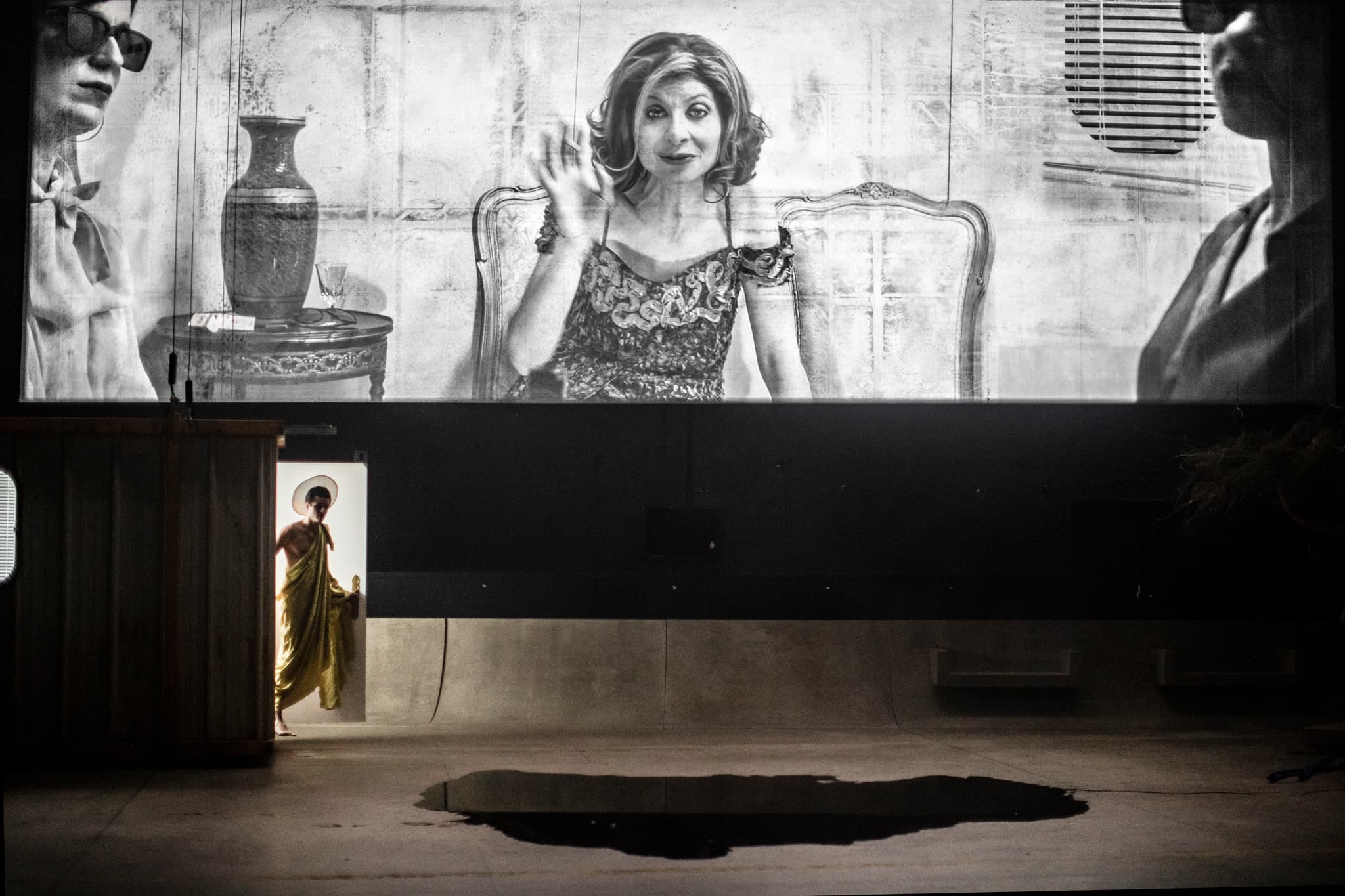 Le gros plan ouvre alors une seconde scène : le visage devient icône négative, un site où la présence vacille, où les affects se lisent comme des intensités brisées. Le visage — sa nudité exposée — entre en combat, on le sait, avec les signes voilés du sexe, exhibé ici avec jeu : dès lors, il propose un régime d’apparition qui contourne le hiatus entre ce que le corps montre et ce que le texte profère. Ce travail du visage dialogue explicitement avec celui de Castorf, ou de Julien Gosselin, ou de Séverine Chavrier, et toute une tradition désormais où la caméra décompose le corps pour le jeter ensuite à sa totalité quand elle l’expose en scène, selon une oscillation troublante : voit-on mieux le corps agrandi dans le cadre, ou le corps entier mais au lointain, dans l’espace de la scène ?