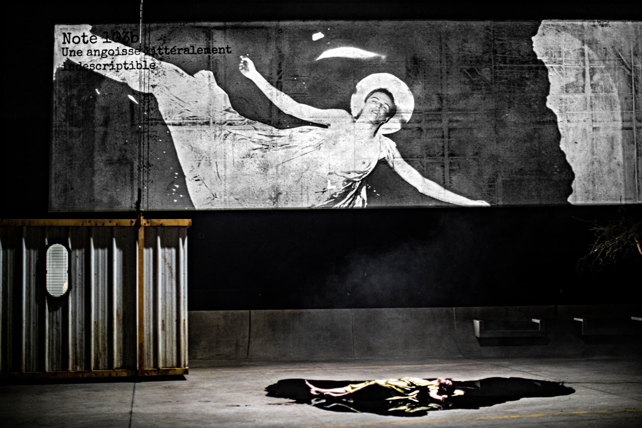 C’est donc dans cette image que le spectacle trouve sa fin : Carlo-ange, surexposé, couché dans une flaque noire, miroitement de pétrole et de ciel, battement d’ailes dérisoire, voix qui s’effile. Une fin suspendue, fin qui n’en est pas une, fin qui imite la mer : recouvre et ouvre, s’échoue sur ses propres rives.