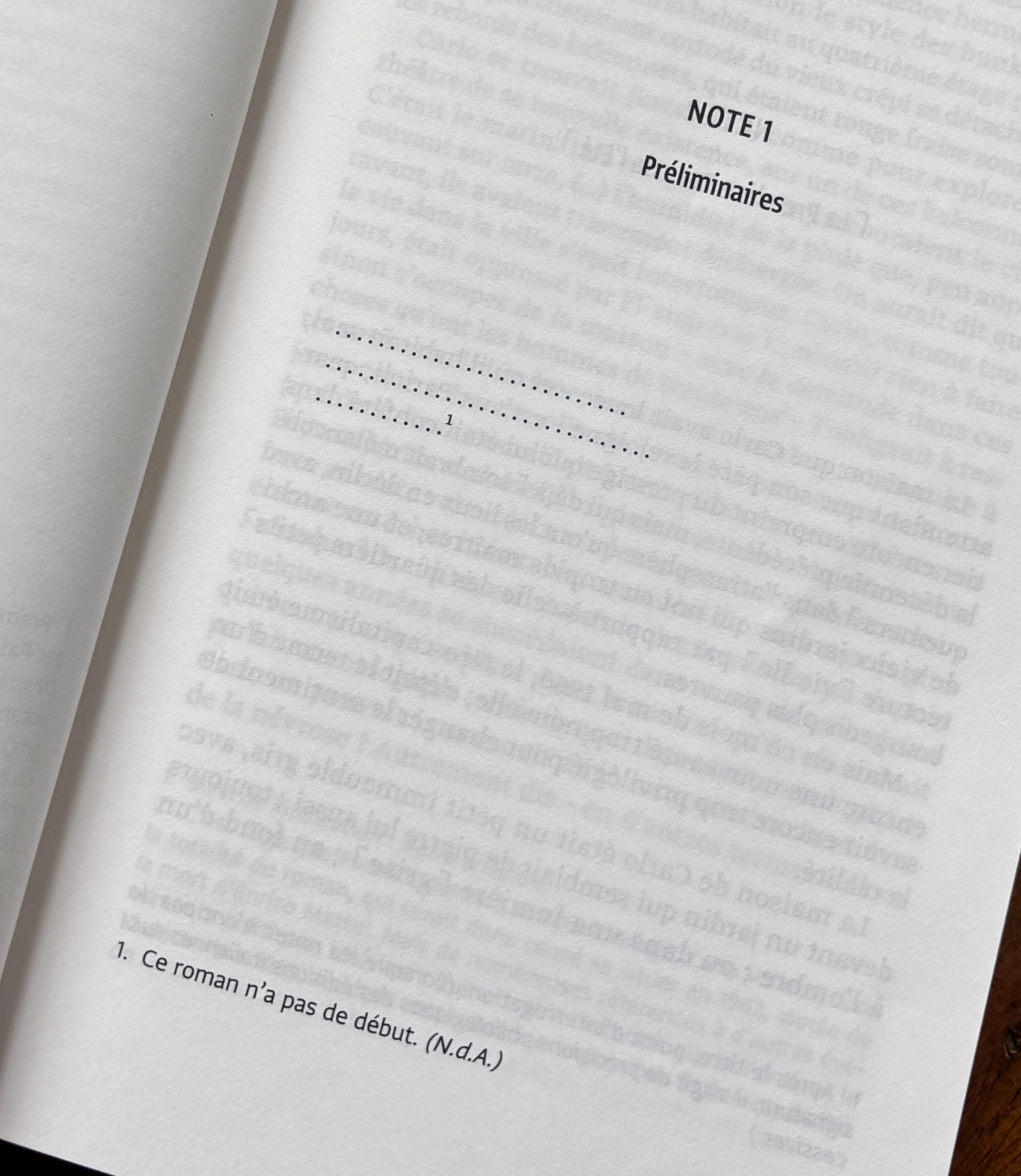 Conséquence : pas de chapitres dans ce roman, qui désignerait trop visiblement la perspective historique de la subordination de la forme à l’intrigue, mais des « notes », entrées fragmentaires, qui fonctionnent comme des éclats d’un texte en mouvement, ou comment le récit premier est celui qui donne à voir l’aventure de l’écriture, et de l’écriture exhibée au moment et comme lieu de sa pensée même : « Notes », comme s’il s’agissait moins d’écrire que d’envisager ce qui va s’écrire — et jeter là des idées pour plus tard, quand bien même on n’y reviendra plus (la vie ou la mort, en décideraient autrement).